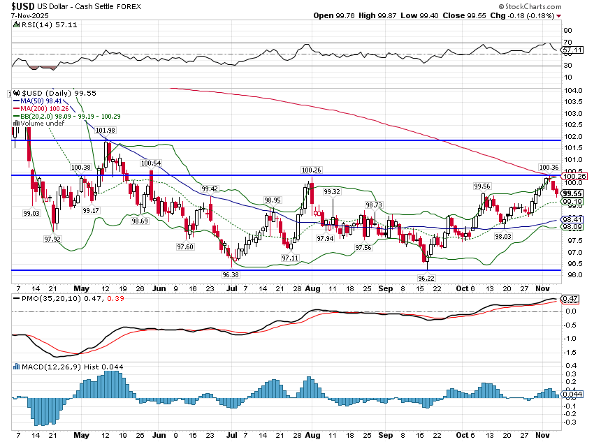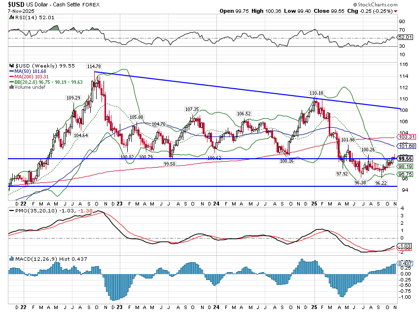 The dollar is still down YTD, 1-year, and 3-years but has recently come off its lows. I wrote previously that a rally up to this 100 area was likely and that it could extend further, possibly up to the 103 area. The movements of the dollar can generally be interpreted as changes in relative growth expectations between the US and the rest of the world so this might indicate that our position has improved slightly recently. But frankly, I don’t see any reason to expect that the US economy can sustain growth faster than the rest of the world. AI infrastructure is somewhat focused in US companies but its application – assuming it is the big deal everyone believes – will be global. In any case, I remain somewhat skeptical that we will see any big benefit soon. Even if it is a productivity boost, the capital spend to date is so large that it will be difficult – very difficult – to generate a reasonable return on investment. There are other reasons to believe the dollar will continue to weaken – mainly that the Trump economic team wants a weak dollar – so any rally seems likely to be short lived.