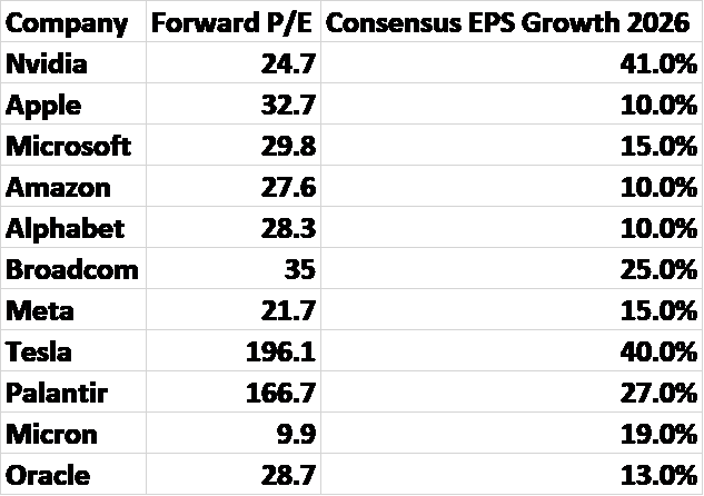 Of course, these are just the best guesses we have about how these companies will perform this year. And some of these are really expensive with P/Es much higher than their expected growth. But overall, I would say that the surprising thing here is that the valuations are high but not outrageously so. If this is deemed a bubble in the future it will likely be because AI didn’t even come close to living up to its hype.