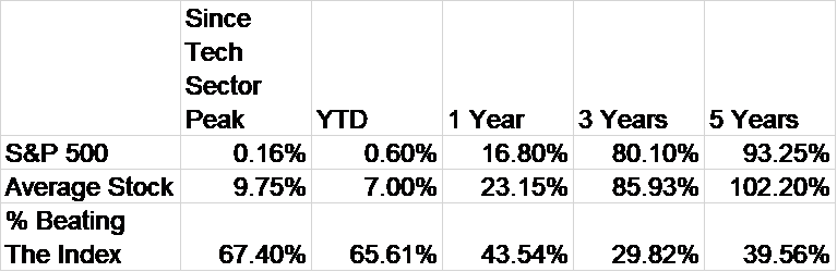 Over the last four months, as the S&P 500 has treaded water, the average return of a stock in the index is 9.75%.