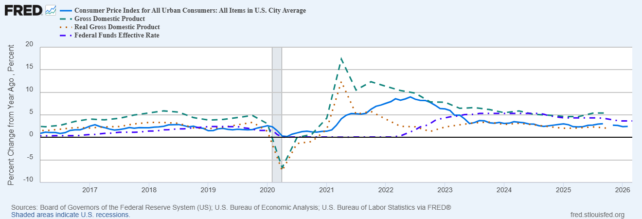 The uncertainty in 2025 – and so far in 2026 – on the other hand was driven by expectations about changes in non-monetary economic policies and geopolitics. We have had heightened volatility in stocks during Trump’s second term because his style of negotiating – to be polite about the implementation of his tariff regime – is to create uncertainty for the other party. Unfortunately, the uncertainty is not confined to the negotiators; it affects markets too, which in turn affects the negotiations (TACO) and creates even more volatility. No one knows what to expect from day to day, especially now that the initial round of tariffs have been ruled illegal. As the administration continues to knit together another set of tariffs to mimic the ones that were struck down, the market must contend with new announcements on a near daily basis. Several were made just last week concerning aluminum, steel and pharmaceuticals. And there will be more.