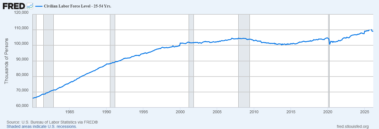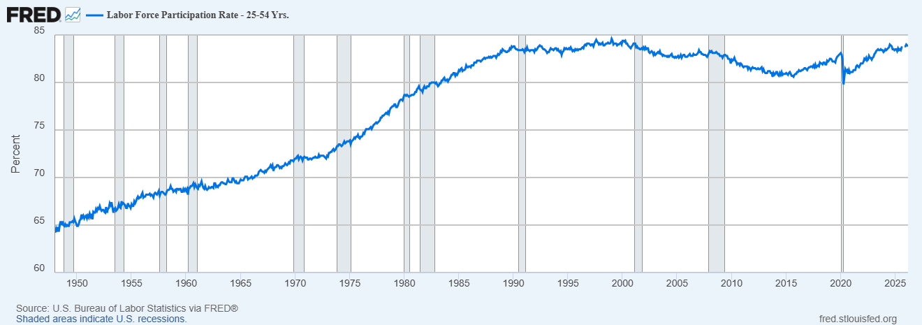 Meanwhile, the labor force participation rate for 25-54 year olds is near an all time high: