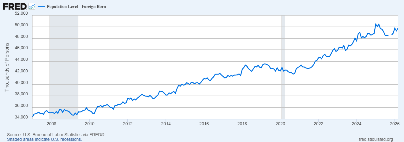 The President’s tariff policies have gotten the most attention from markets but I think it is actually his immigration policies that are the biggest risk to growth. Under this administration, immigration has been pushed to zero and maybe even into negative territory. The problem with that is that our prime working age population isn’t growing without immigration. The 25-54 year old cohort (prime working age) has grown since the end of COVID but by less than the foreign born population.