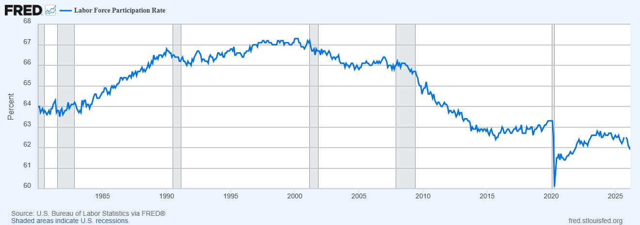 The annualized rate of growth for Real GDP from 2022 to 2025 was 2.3%. From 2010 to 2019 – pre-COVID – the annualized rate of RGDP growth was…2.3%. Do you think that is coincidence? I sure don’t. As I’ve written about numerous times in the past, economic growth can be boiled down to just two things – productivity growth and workforce growth. And actually it isn’t just workforce growth but also the participation rate and the intensity of that work (hours worked). If we look at the 2010-2019 period we find that productivity growth averaged 1.3% over the decade and workforce/hours growth averaged 1% and voila, add them together and real economic growth was 2.3%. Today, after all the distortions of COVID have passed through the system, we’re right back where we started, but more than a little deeper in debt.