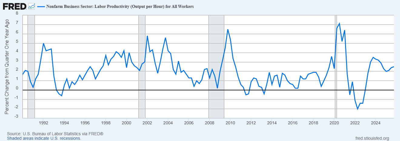 All of these trends together mean that the workforce part of our economic growth equation isn’t helping and may in fact be subtracting. Which means that if we are to continue our past trend of 2.3% RGDP growth, it will all have to come from productivity growth, recent data on which has been pretty good. But can it continue to carry all the weight of economic growth? All I can say is that AI better be all it’s cracked up to be. And it better start to pay off soon.
