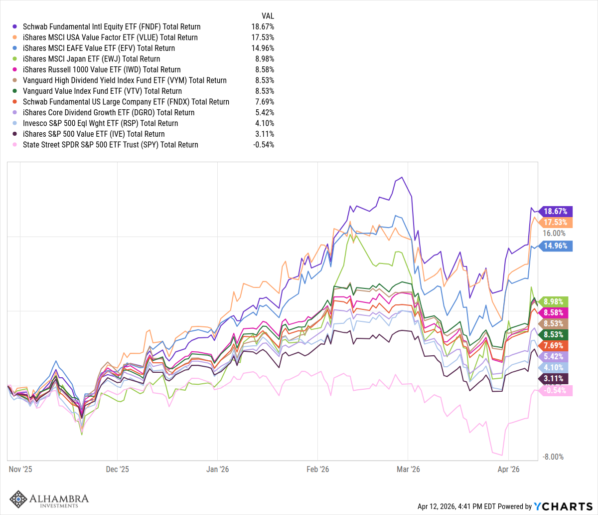We made a choice several years ago to diversify away from the S&P 500 because we were not comfortable with the large allocation to technology stocks. We shifted some of our US large cap investments overseas, some to value, and some to dividend growth. The international exposure was driven by our views on the dollar and has paid off nicely, especially over the last year. But those choices were not perfect, we didn’t get all the best performers. Diversification isn’t about getting it perfect; it’s about reducing the odds of a really bad outcome.
