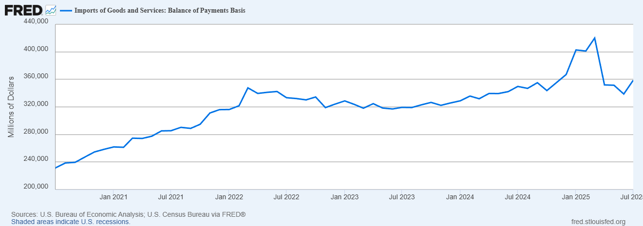 That isn’t, however, an all-clear for stock buyers. Stock prices do respond positively to better economic growth but interest rates matter too. We know that some companies stocked up on pre-tariff goods to avoid the tariffs as long as possible. How widespread that was is hard to say but it was enough to show up in the import numbers: